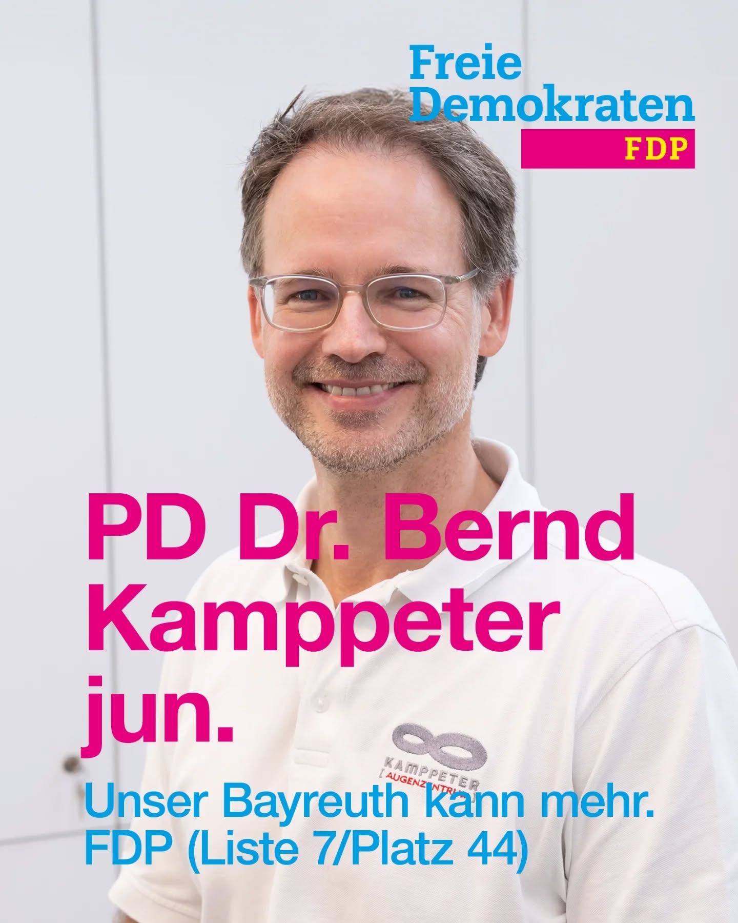 Und zu guter Letzt unser Listenplatz 44: PD Dr. Bernd Kamppeter steht dafür, klare Prioritäten zu setzen und finanzielle Mittel zukunftsorientiert und sinnvoll einzusetzen. Ihm ist wichtig, Bürgerinnen und Bürger stärker selbst entscheiden zu lassen, statt alles bis ins kleinste Detail zu regeln. Dafür braucht es auch den Mut, sich von alten Zöpfen zu trennen und Neues zuzulassen. Er steht für ein Bayreuth, das Prioritäten setzt, Freiräume lässt und mutig nach vorne denkt.