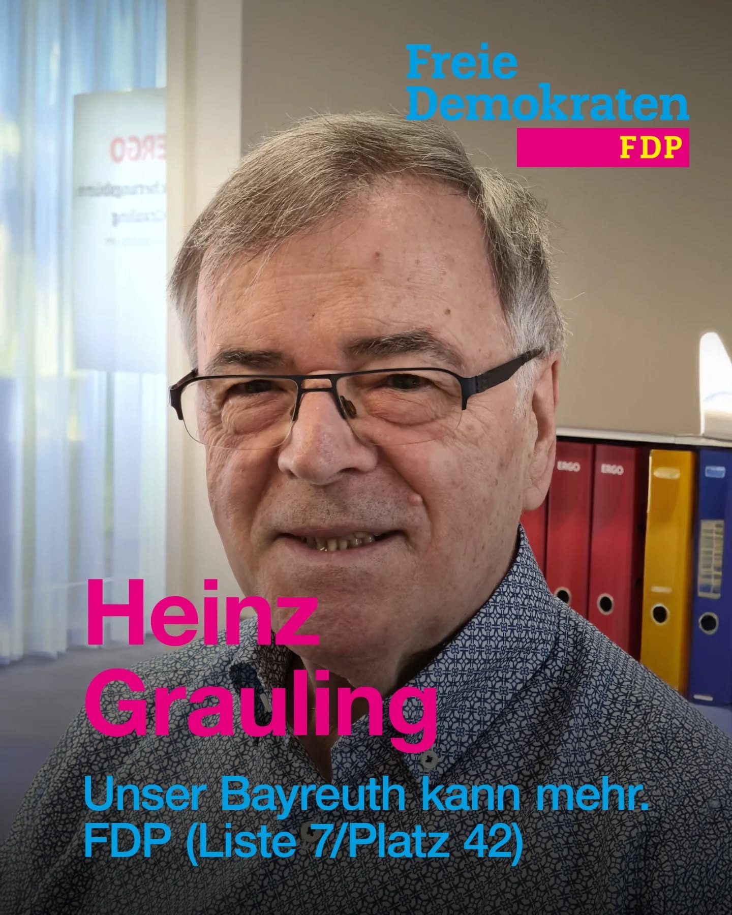 Unser Listenplatz 42: Heinz Grauling ist Ehrenkreisvorsitzender der FDP Bayreuth und engagiert sich seit vielen Jahren aktiv für die Partei. Für ihn stehen Freiheit, Verantwortung und bürgernahes Handeln im Mittelpunkt. Er setzt sich dafür ein, Bayreuth lebendig, modern und chancengerecht zu gestalten. ✨🏛️