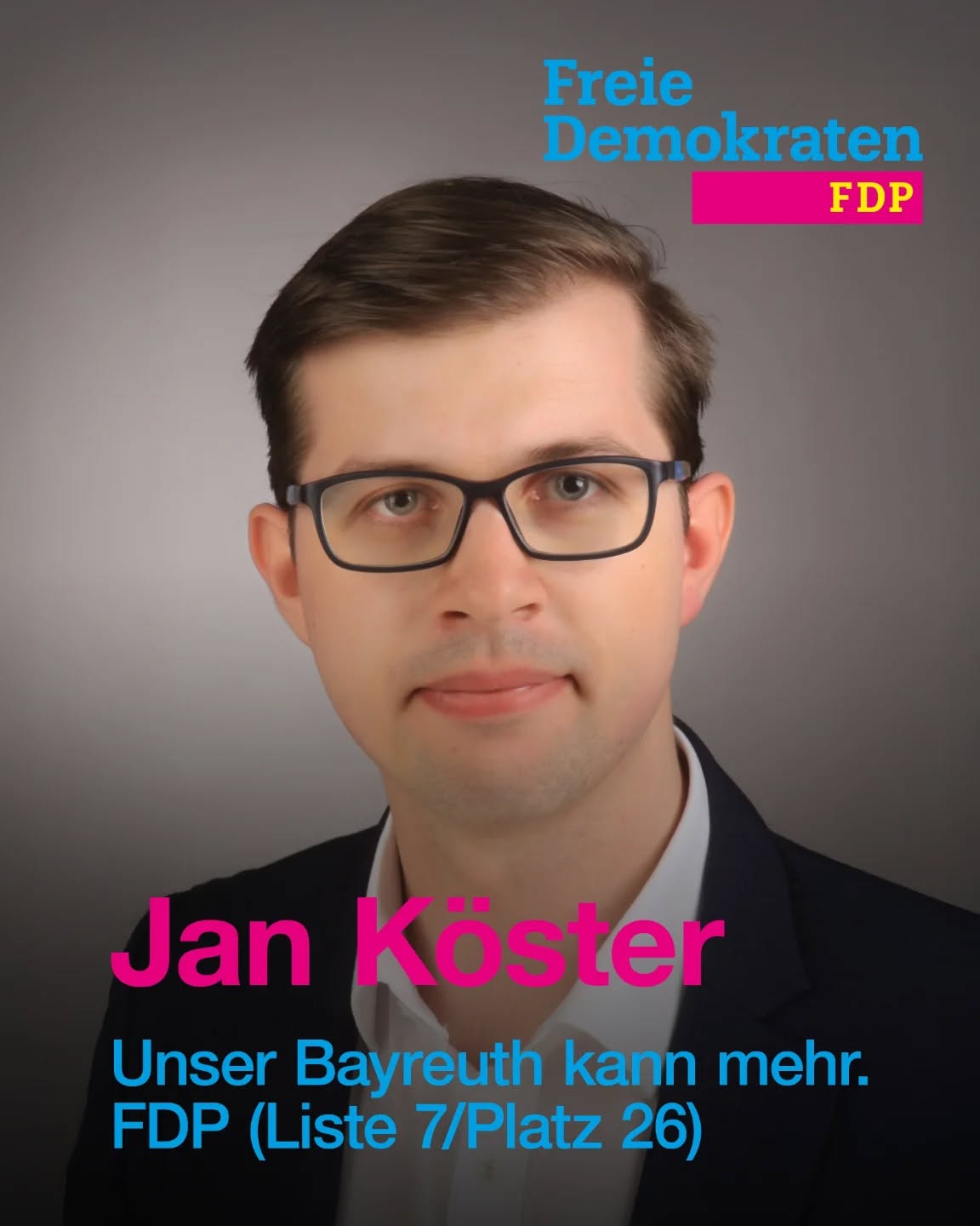 Unser Listenplatz 26: Jan Köster ist 29 Jahre alt, gebürtig aus Niedersachsen und lebt seit 2015 in Bayreuth. Aktuell ist er Rechtsreferendar und seit seinem 16. Lebensjahr politisch aktiv, unter anderem bei JuLis, LHG und FDP sowie im Studierendenparlament der Uni Bayreuth. Seine kommunalpolitischen Herzensthemen sind Verkehr und Infrastruktur, ein starker ÖPNV, solide Haushaltsführung und eine effiziente, bürgernahe Stadtverwaltung. Für ihn zählt: Bayreuth modern gestalten und gleichzeitig die Lebensqualität für alle erhöhen.